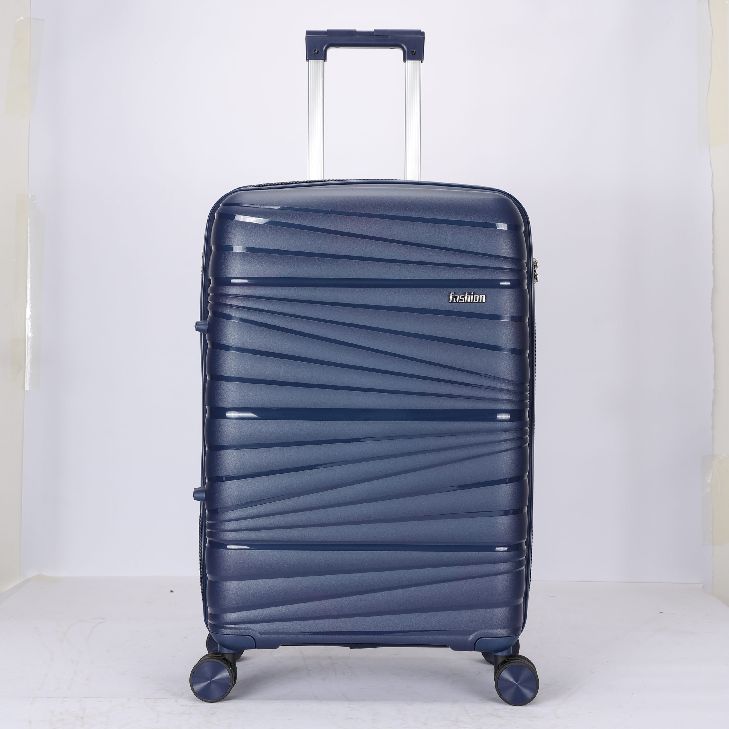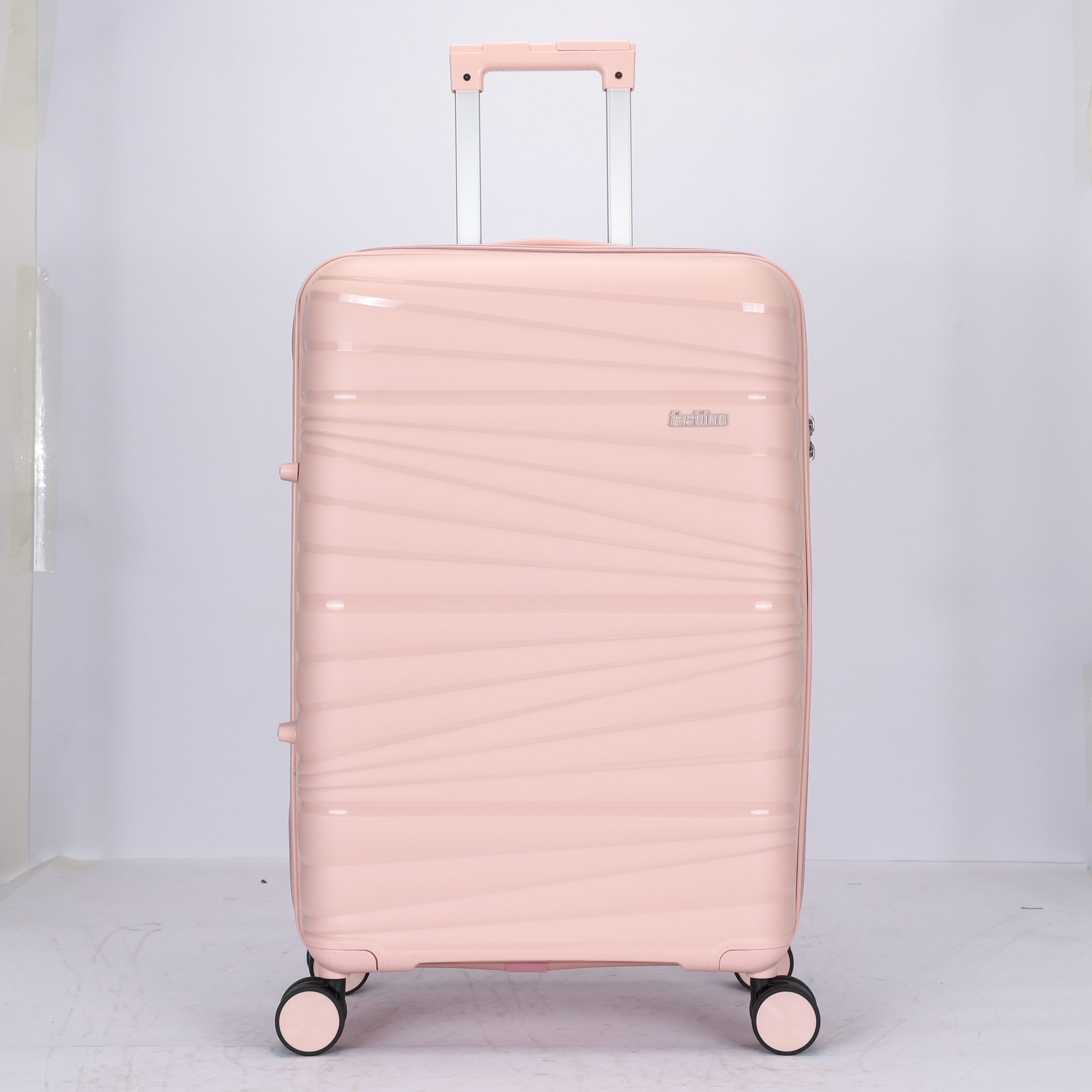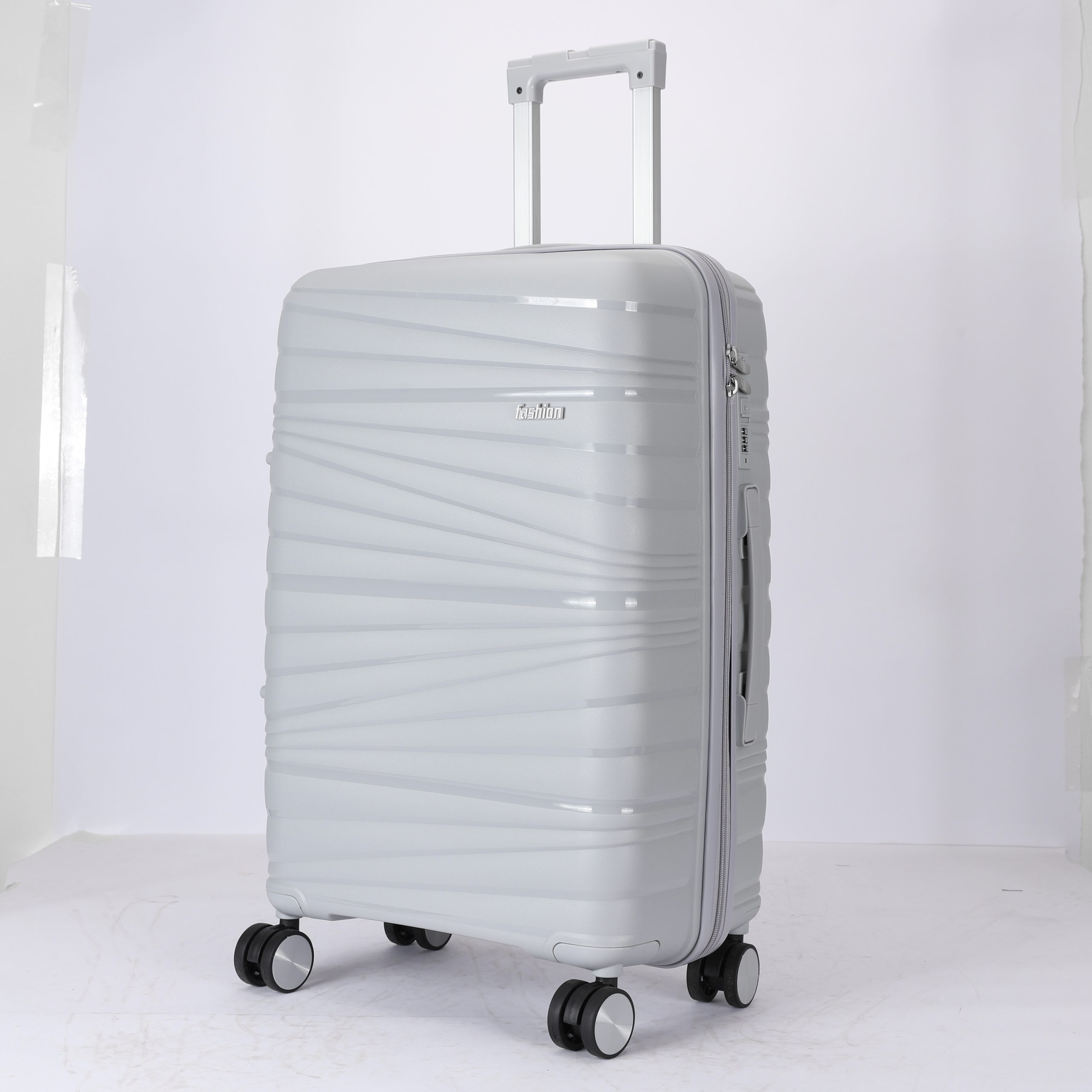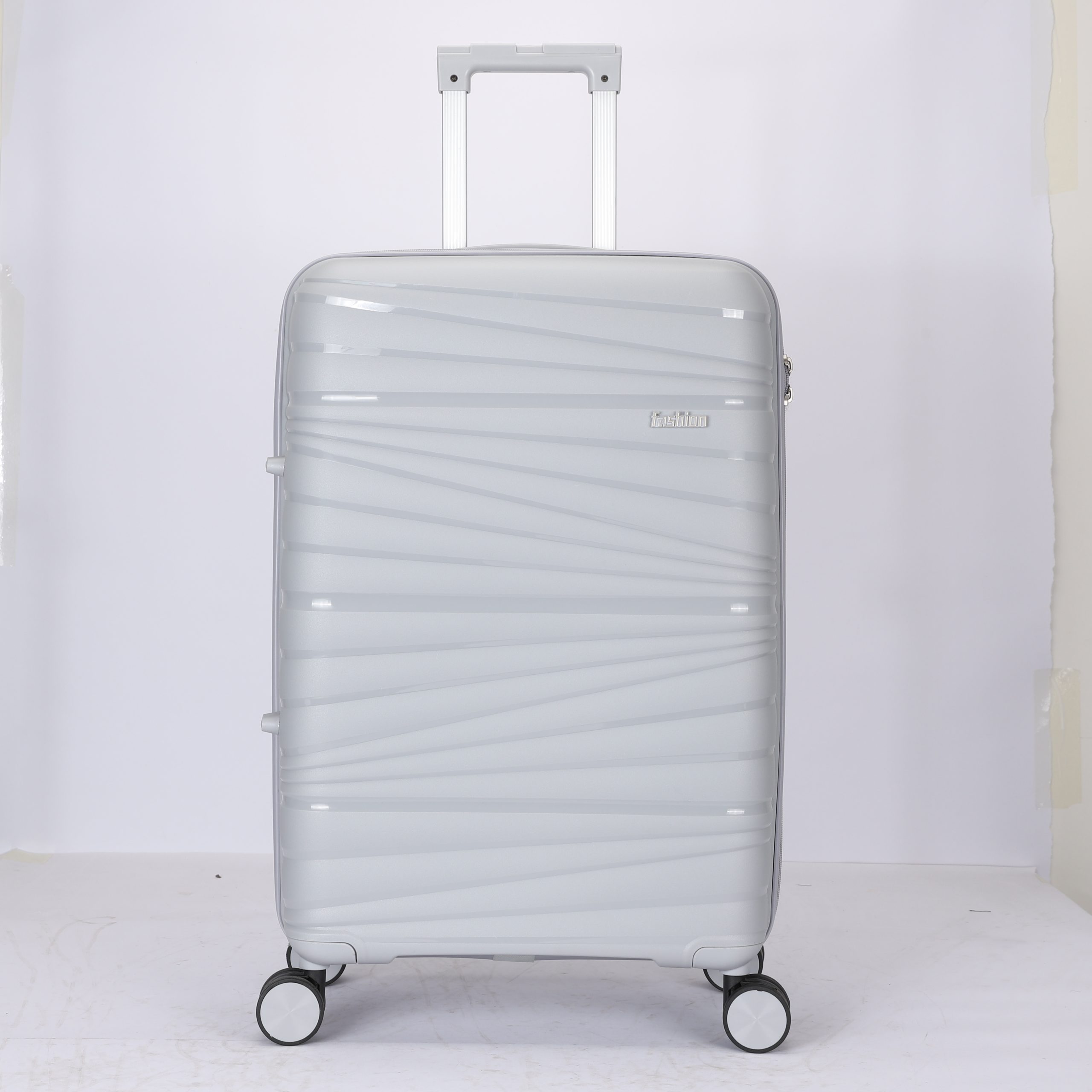 PP hard Shell, 210 D polyester lining, 2 mesh zip pockets, elastic bond for main pocket, “U” shape zipper pocket, 4 spinner wheels, built in combination lock, iron trolley.