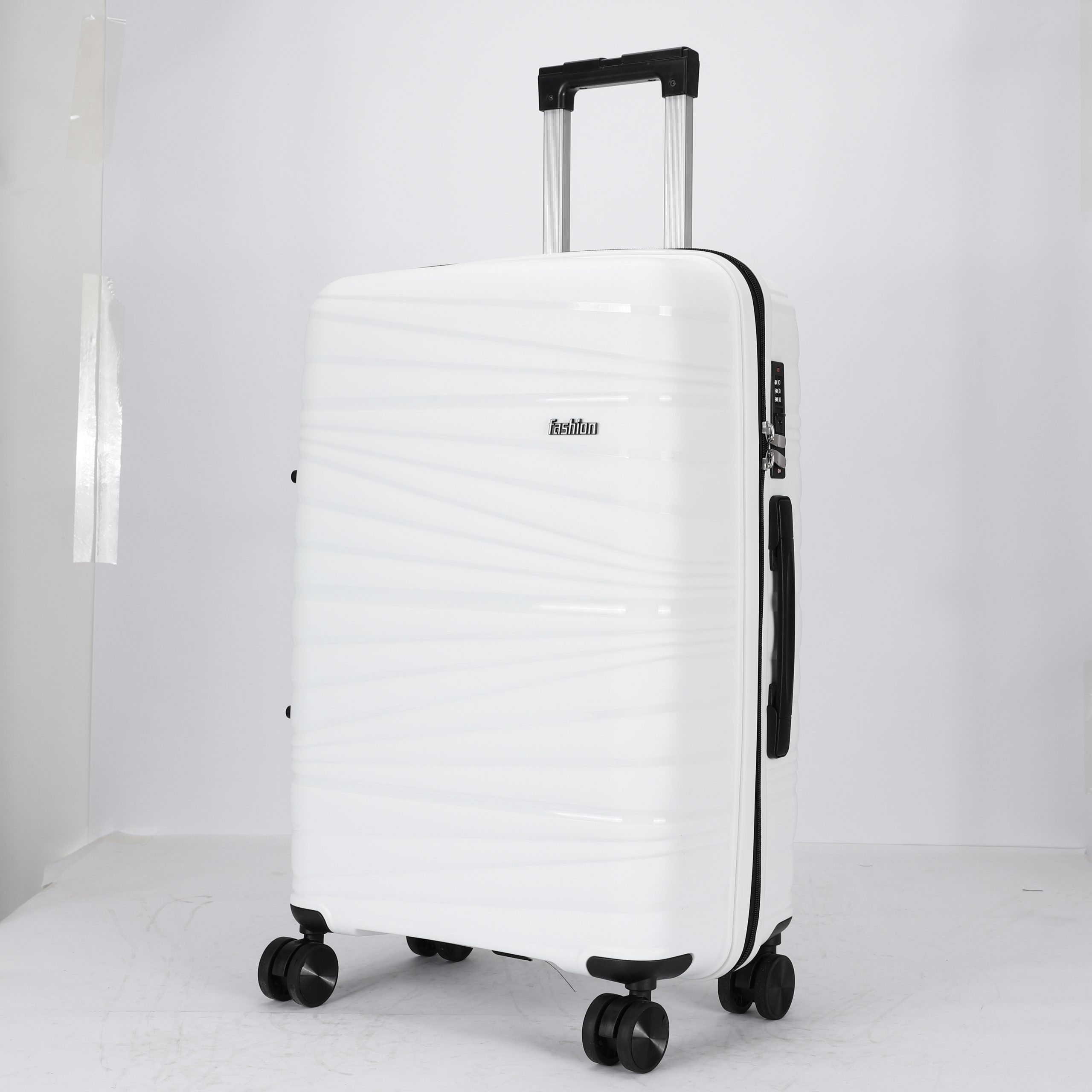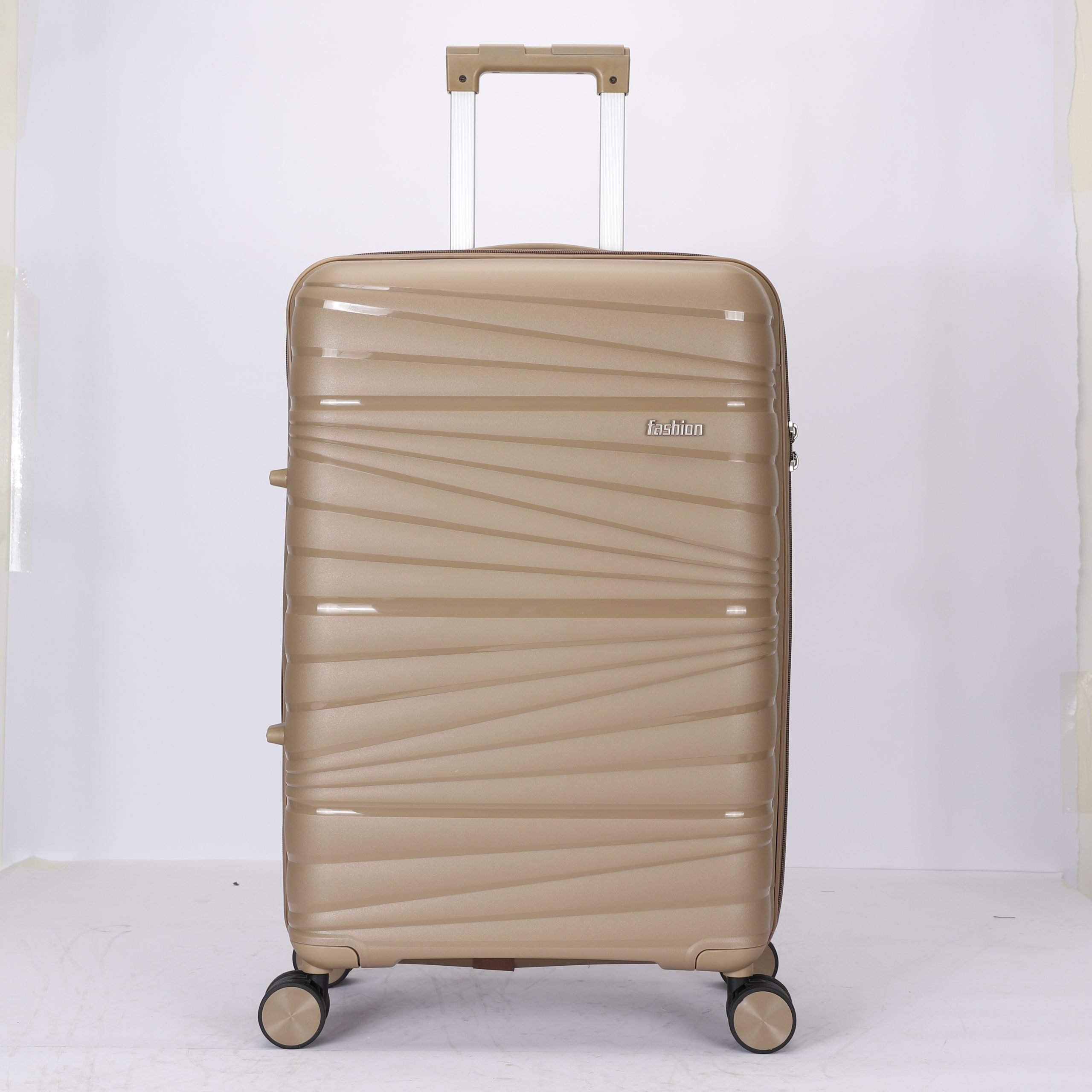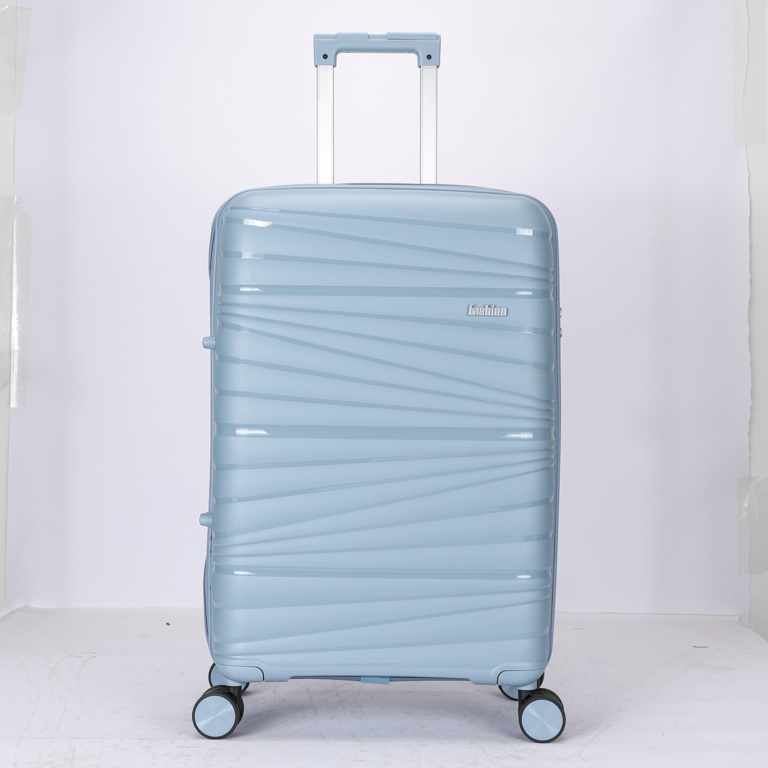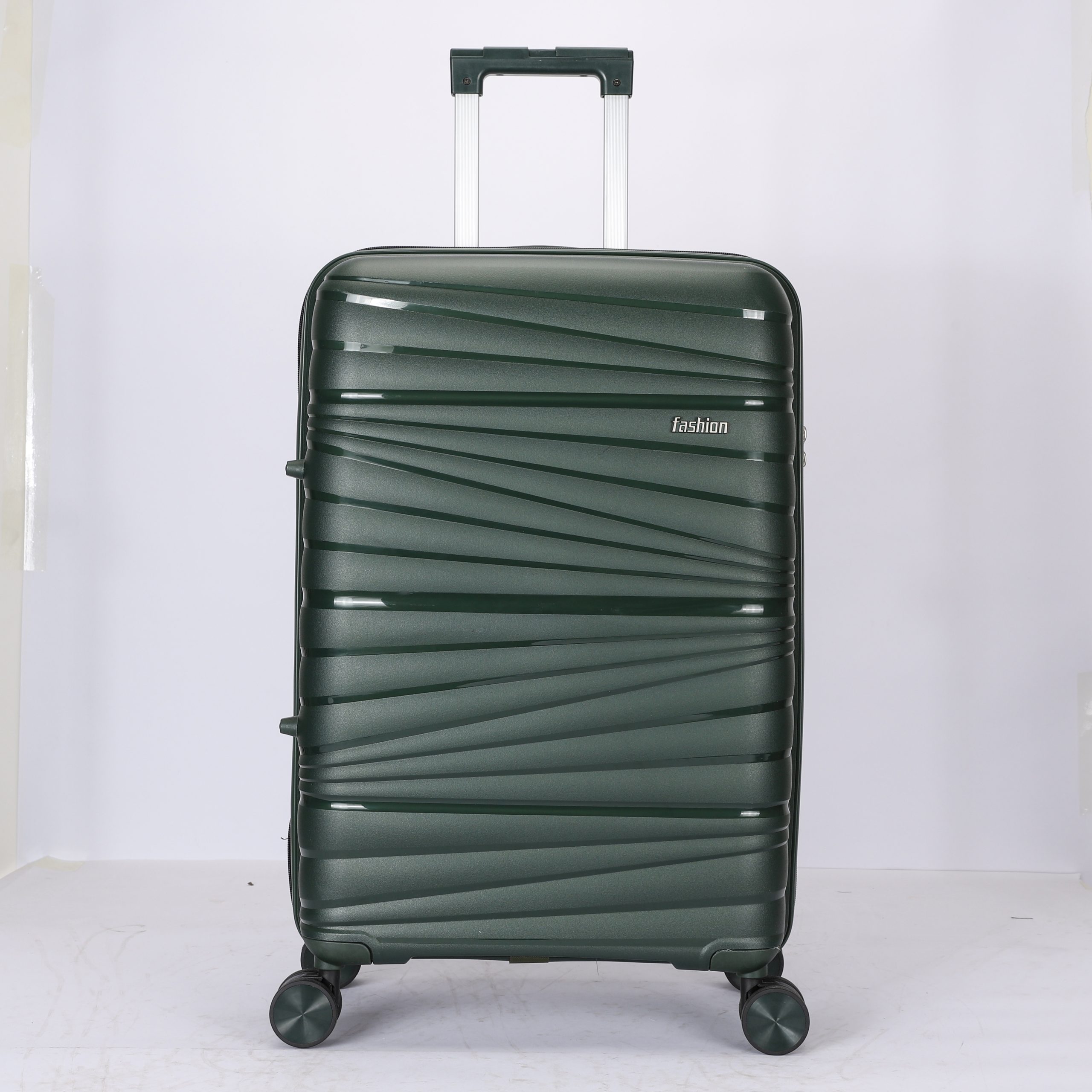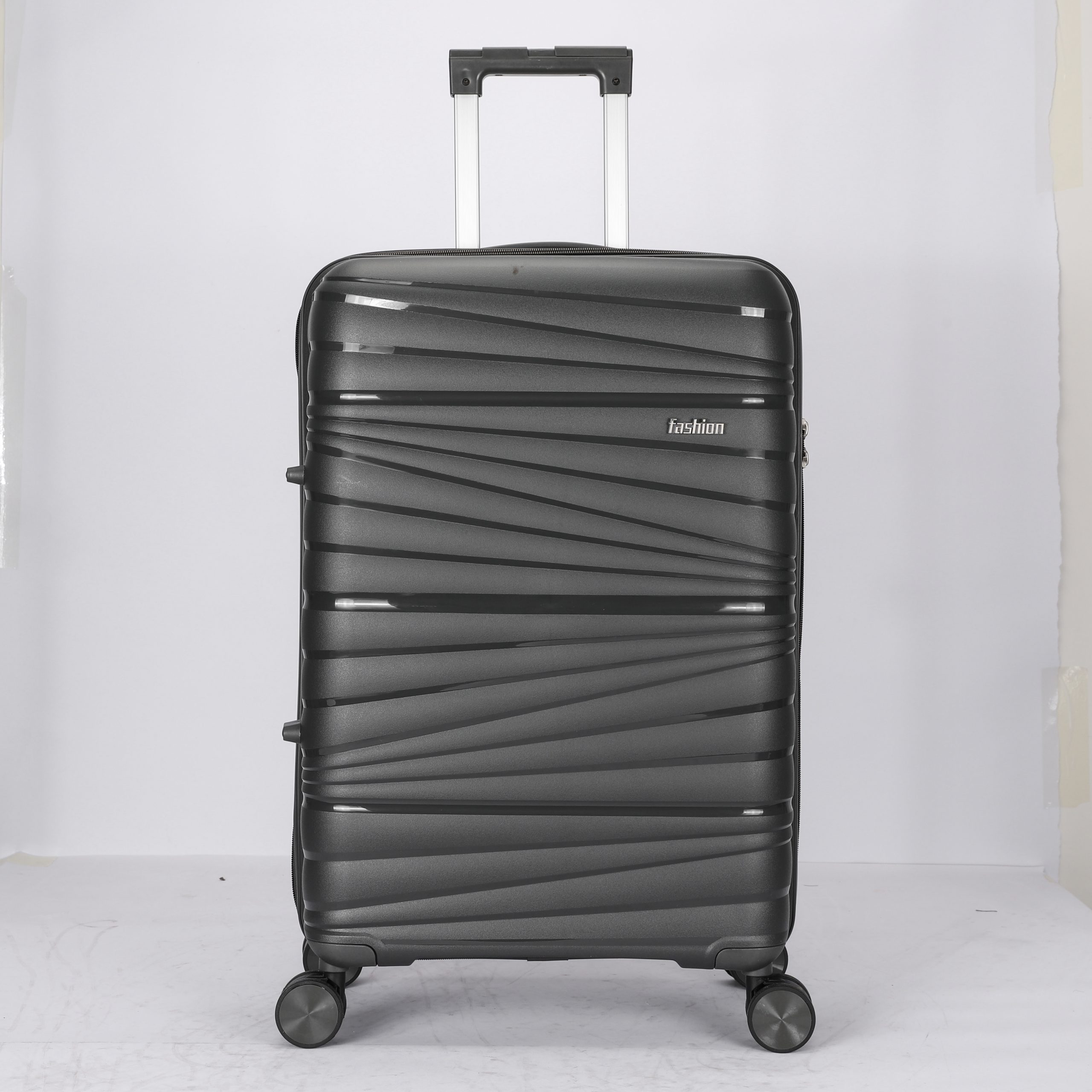 PP hard Shell, 210 D polyester lining, 2 mesh zip pockets, elastic bond for main pocket, “U” shape zipper pocket, 4 spinner wheels, built in combination lock, iron trolley.