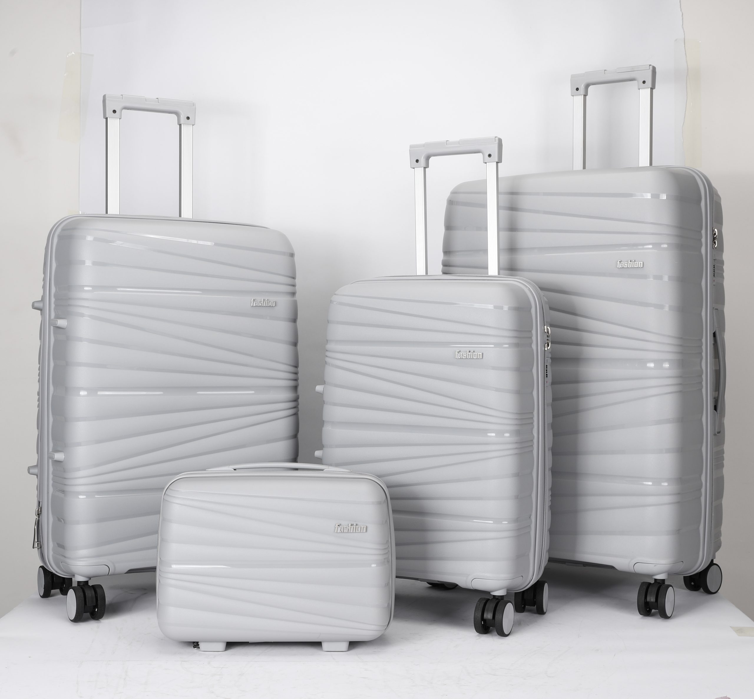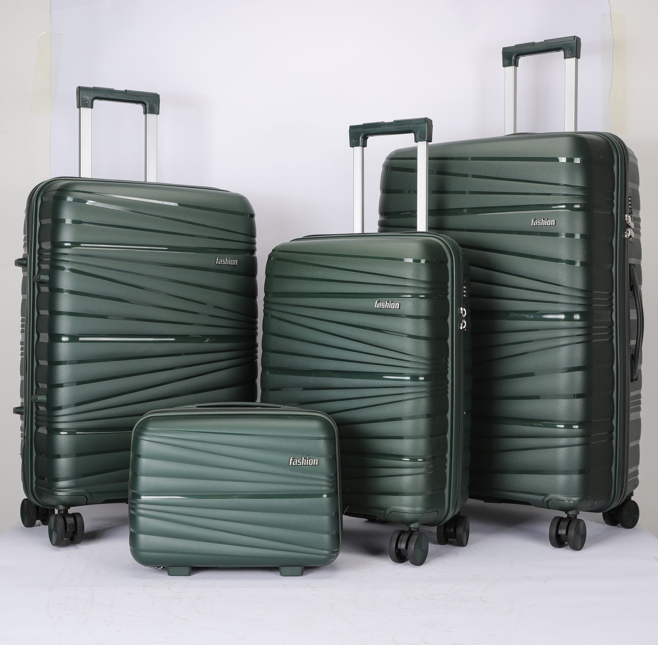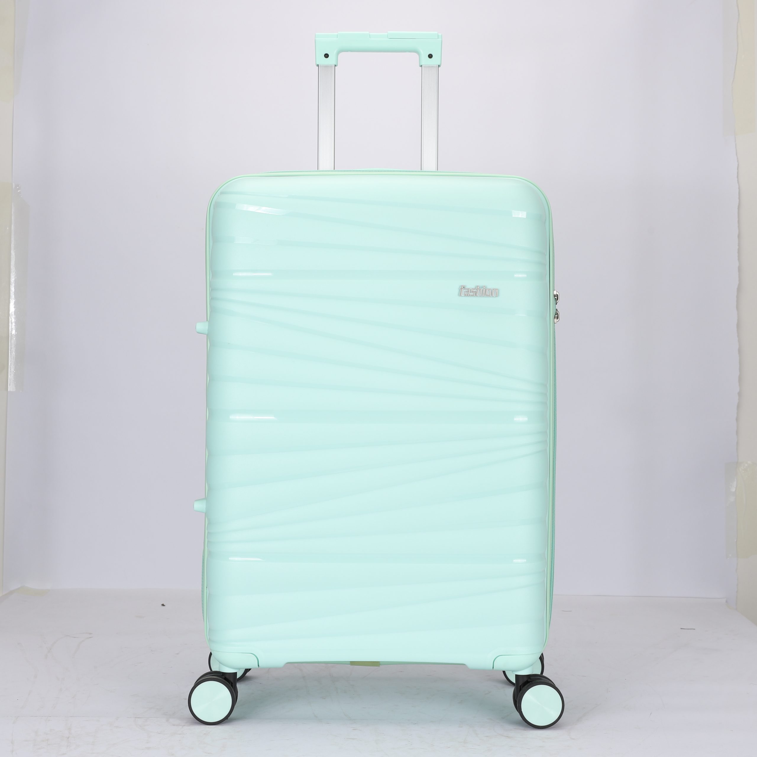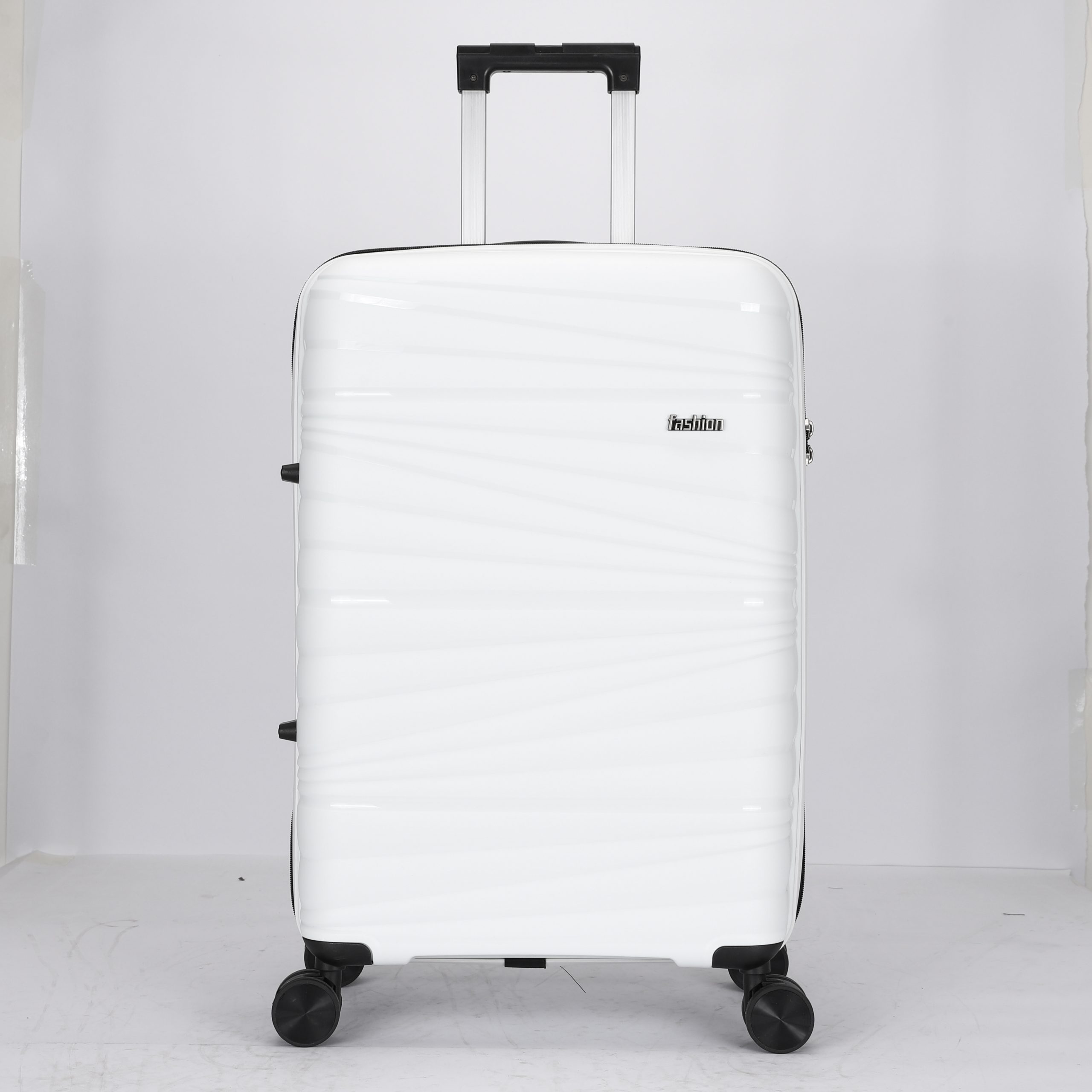 PP hard Shell, 210 D polyester lining, 2 mesh zip pockets, elastic bond for main pocket, “U” shape zipper pocket, 4 spinner wheels, built in combination lock, iron trolley.